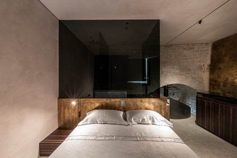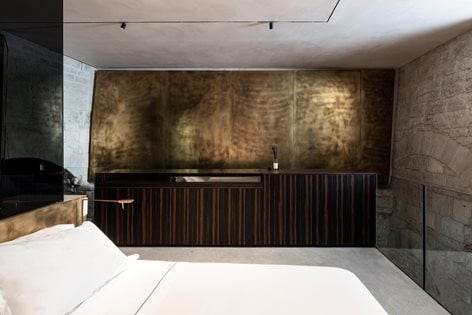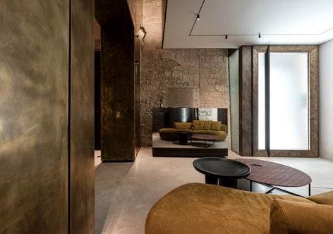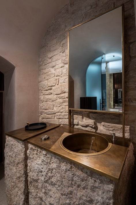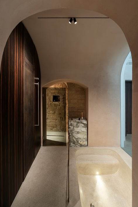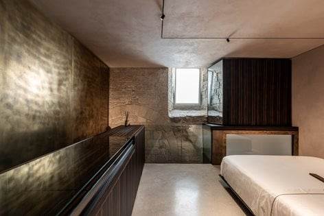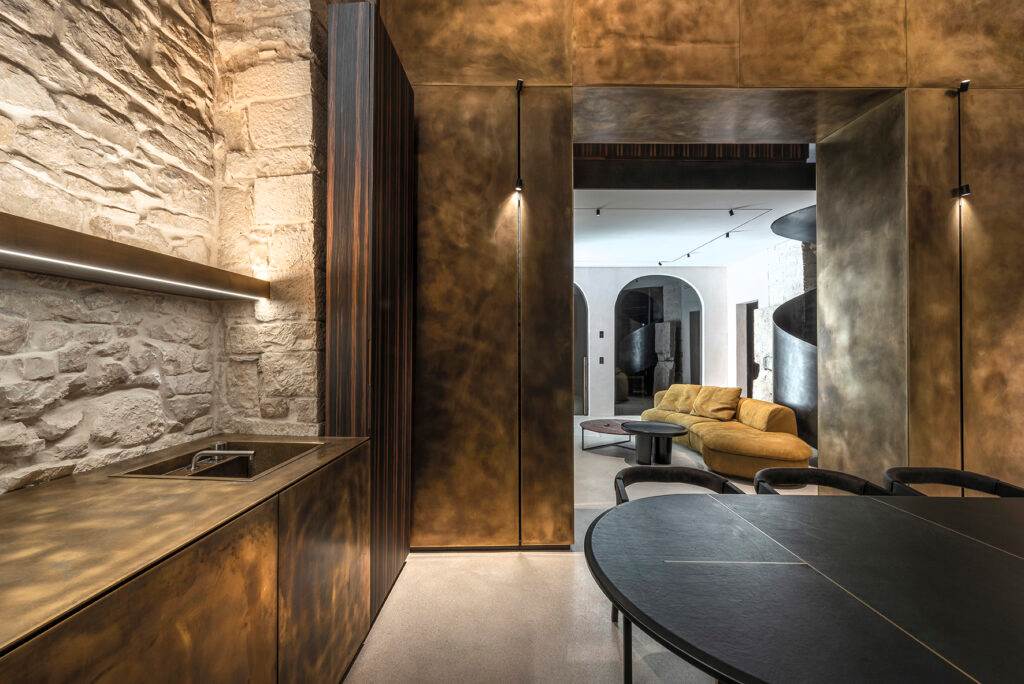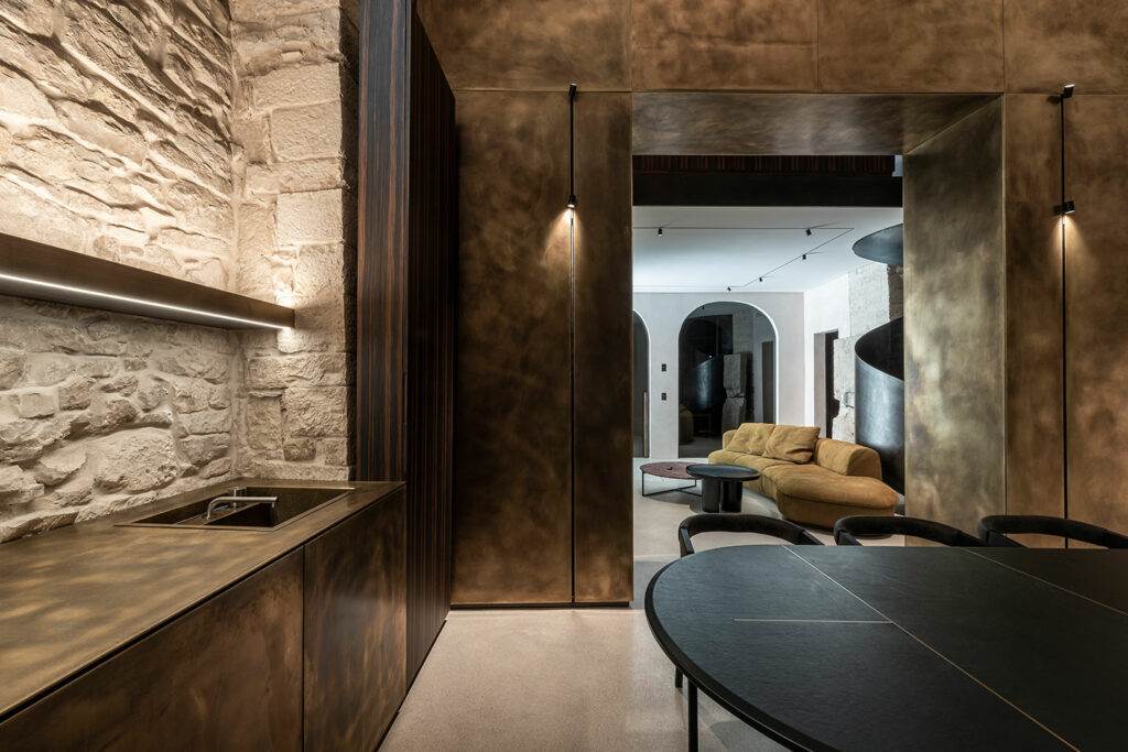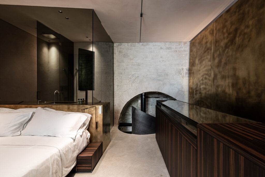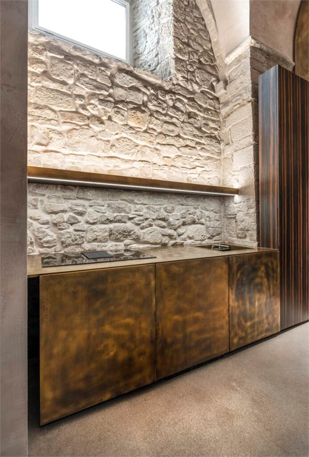 Le antiche pareti, sbucciate e ripulite a mano, rivelano la pietra originaria e il tufo del Duecento, mentre la spettacolare scala elicoidale in acciaio delabrè, vera scultura funzionale, introduce al soppalco di circa 30 mq.
